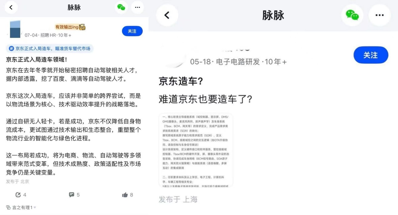 值得关注的是,京东此前就已布局物流领域的无人车/无人机。今年5月就有网友在脉脉爆料,京东早已招聘自动驾驶相关人才。