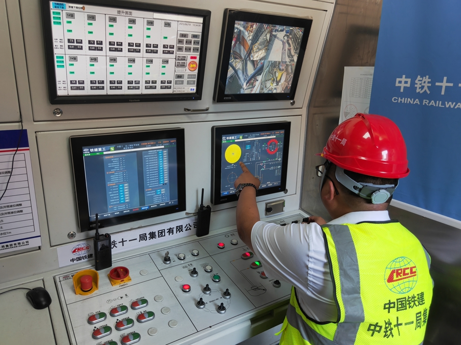 同时,该设备智能化程度高,现场可实现无人化作业,只需一位工作人员在不远处的操作间内监控设备运转即可。竖井掘进机挖掘作业时,需要在井筒内注水泥浆,在水下掘进作业,利用泥浆渣土泵将挖掘出来的泥浆输送至泥浆分离设备中。这种方式极大降低了施工噪音,即便是夜间施工,周边居民楼内也基本听不到设备掘进作业的声音。
